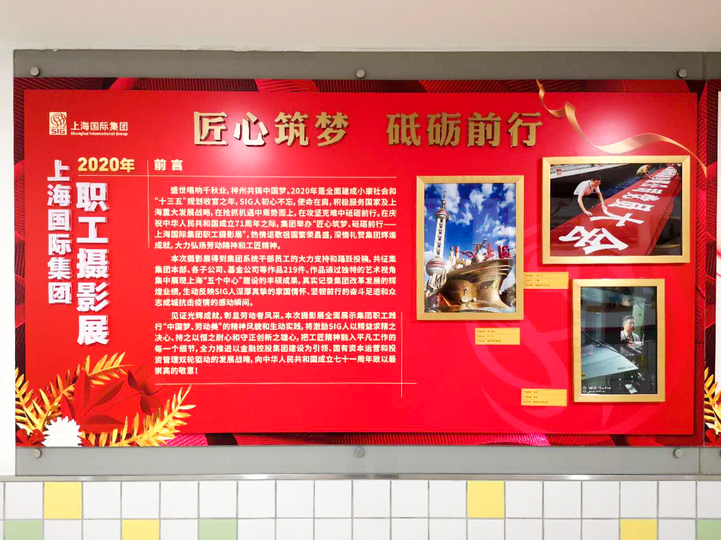 SIG received 219 contributions from the headquarters, subsidiaries and fund companies, and selected excellent works for an exhibition on the 9th floor of SIG Building. The exhibition has five sectors: "New Era, New Dream", "Craftsmanship", "Anti-Epidemic Fight", "Vitality & Passion" and "Beautiful Country". From different perspectives and sides, the artistic works showcased Shanghai's fruitful results in the building of "five centers", SIG's brilliant achievements in reform and development, the toughness of SIG's employees, touching stories of fighting the epidemic together, SIG's colorful cultural and sports life, as well as the beautiful country.
