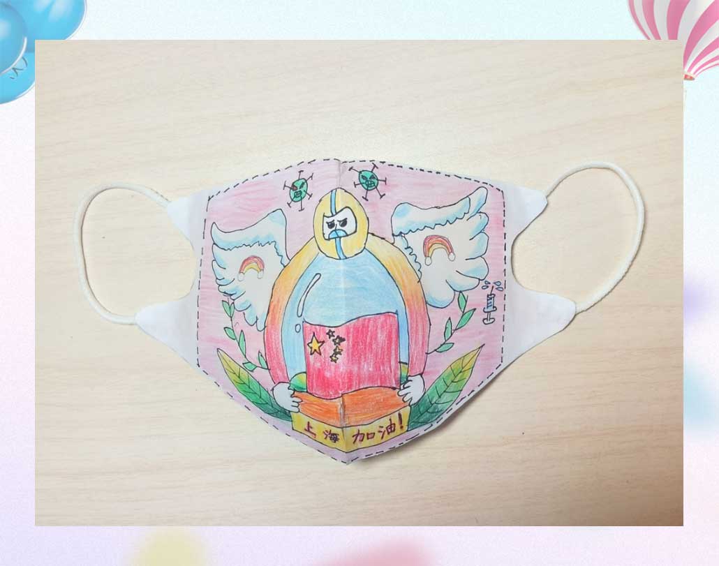 Painter's word: I used paper and color pencils to make a mask and named it ""Frontline against the epidemic", to express my admiration and praise for frontline anti-epidemic workers, as well as my wish to root for Shanghai's fight against the epidemic and guard our beautiful home.