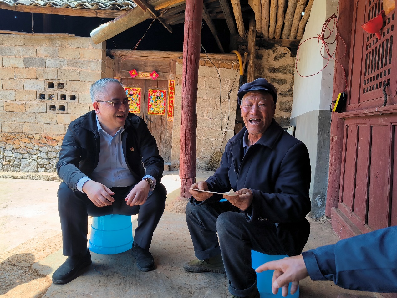 After a one-day travel, Yu and his team reached Chushuizhai Village on the morning of March 24, setting foot on the hot land on the heels of spring. They came with problems and hopes, expecting to find out the villagers' needs, and solicit opinions and suggestions from them through a field survey. Upon their arrival at the village committee, Yu and his team held a Party building seminar with heads and Party member representatives of Qiubei County, Yuezhe Town and Chushuizhai Village under the theme of "Comprehensively Implementing the Spirit of the 20th CPC National Congress, Portraying a New Blueprint for Rural Revitalization". At the seminar, the two sides discussed deepening the mechanism for normal and long-term Party history learning and education, exchanged their experiences of studying the spirit of the 20th CPC National Congress, explored the path of rural revitalization based on the actual wishes of locals, planned for a new round of support from 2023 to 2025, and discussed a series of support projects such as incentive for marigold planting, drinking water supply, and the construction of Party building bulletin boards, to enhance ideological guidance to local Party members and people, boost the internal dynamism of rural revitalization, ensure food hygiene for local children, and solve the problem of drinking water. The two sides agreed on promoting the implementation of the key livelihood projects involved in the practice of "doing practical things for the people", to do practical things in mountains, achieve results that satisfy locals, and solve the people's pressing problems and enhance their well-being.