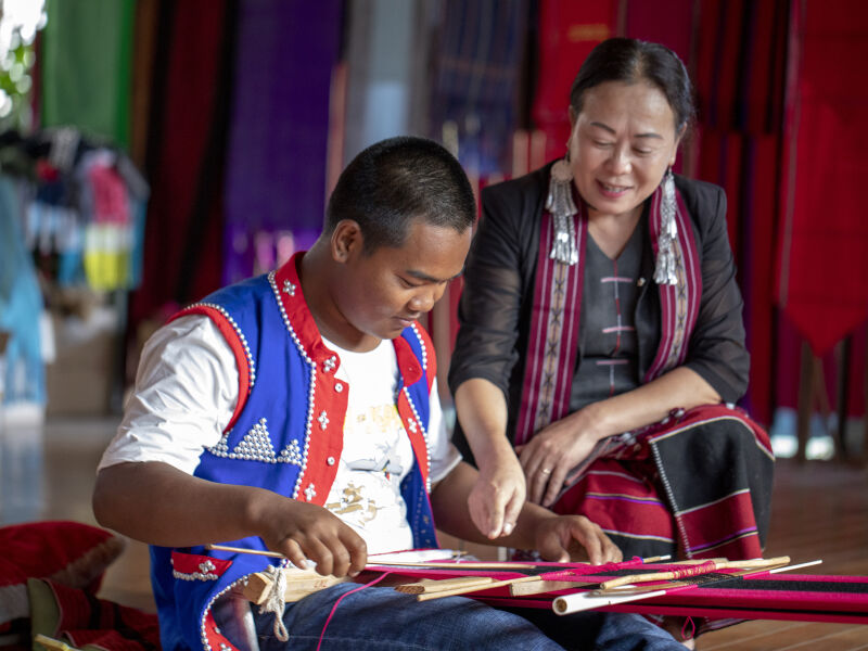 2024年,“文化遺美”項(xiàng)目聚焦國(guó)家級(jí)非遺佤族織錦,以“滬滇非遺對(duì)話”為主題,促成佤族織錦與上海海派絨線編結(jié)技藝的交流。同時(shí),邀請(qǐng)上海大學(xué)上海美術(shù)學(xué)院設(shè)計(jì)團(tuán)隊(duì),通過(guò)現(xiàn)代設(shè)計(jì)理念和工藝,為佤族織錦注入新活力,助力傳統(tǒng)技藝符合市場(chǎng)需求。
