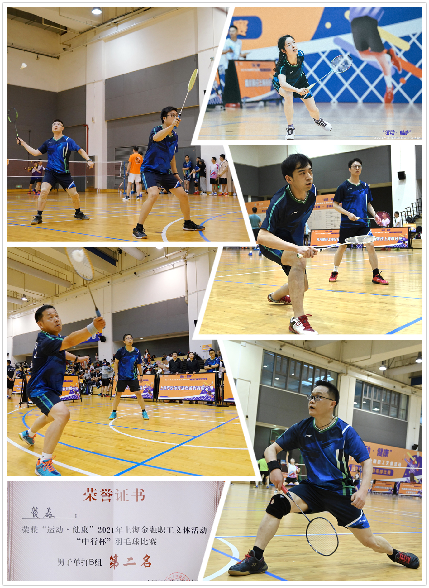 氣溫驟降也絲毫未阻擋集團運動健兒奮勇拼搏的火熱激情。SIG羽壇健將們善攻能守,招招緊逼對手,其他代表隊選手實力也不容小覷,比賽現場令人目不暇接。經過首輪3場小組賽,集團羽毛球隊在3個項目中成功晉級下一輪。在更為激烈和殘酷的淘汰賽中,集團本部的賀磊經過3場鏖戰,面對強勁對手,精準扣殺,賽出水平,賽出風采,勇奪男單B組第二名,同時也創造了集團參加市金融系統比賽的最好戰績。
