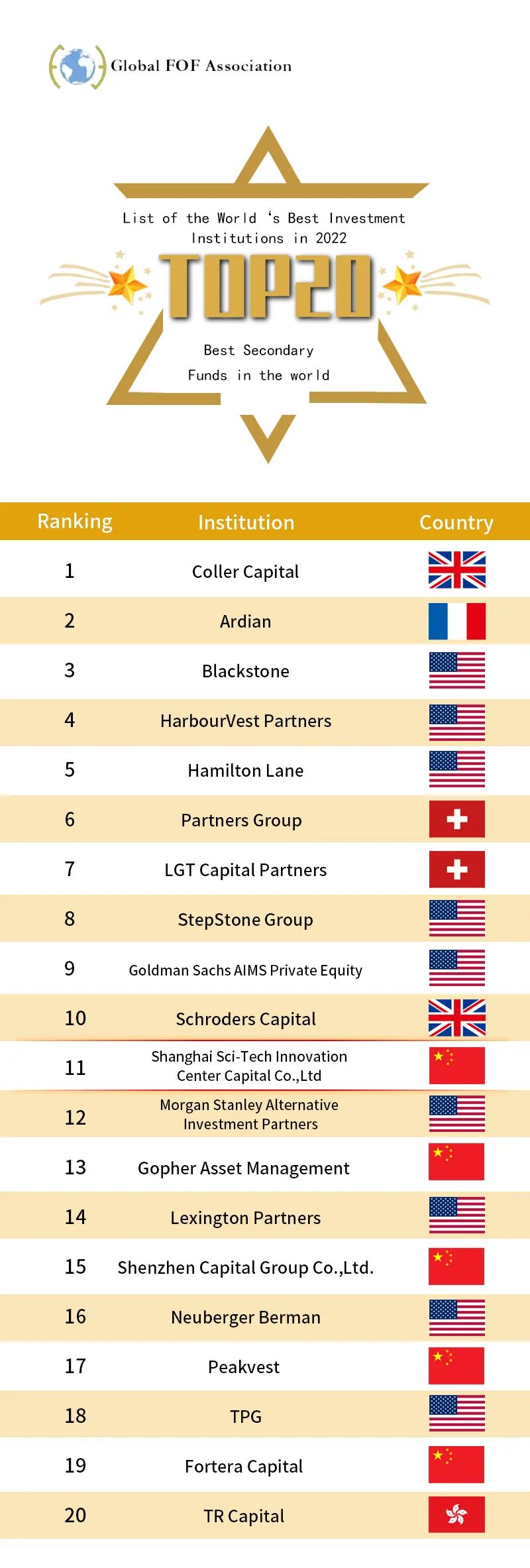 2023年2月16日,全球母基金協會于瑞士蘇黎世重磅發布“2022全球最佳投資機構榜單”,上海科創基金榮獲“全球最佳S基金TOP20”(TOP20 Best Secondary Funds in the world)。