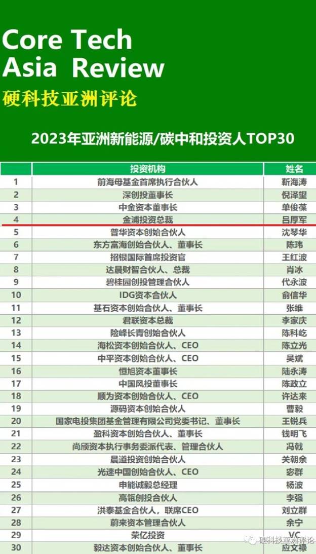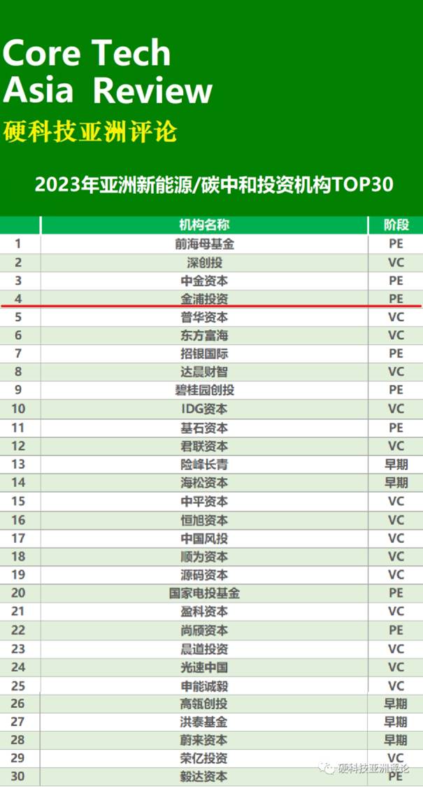 金浦投資榮登2023年“亞洲新能源/碳中和投資機構(gòu)TOP30”榜單