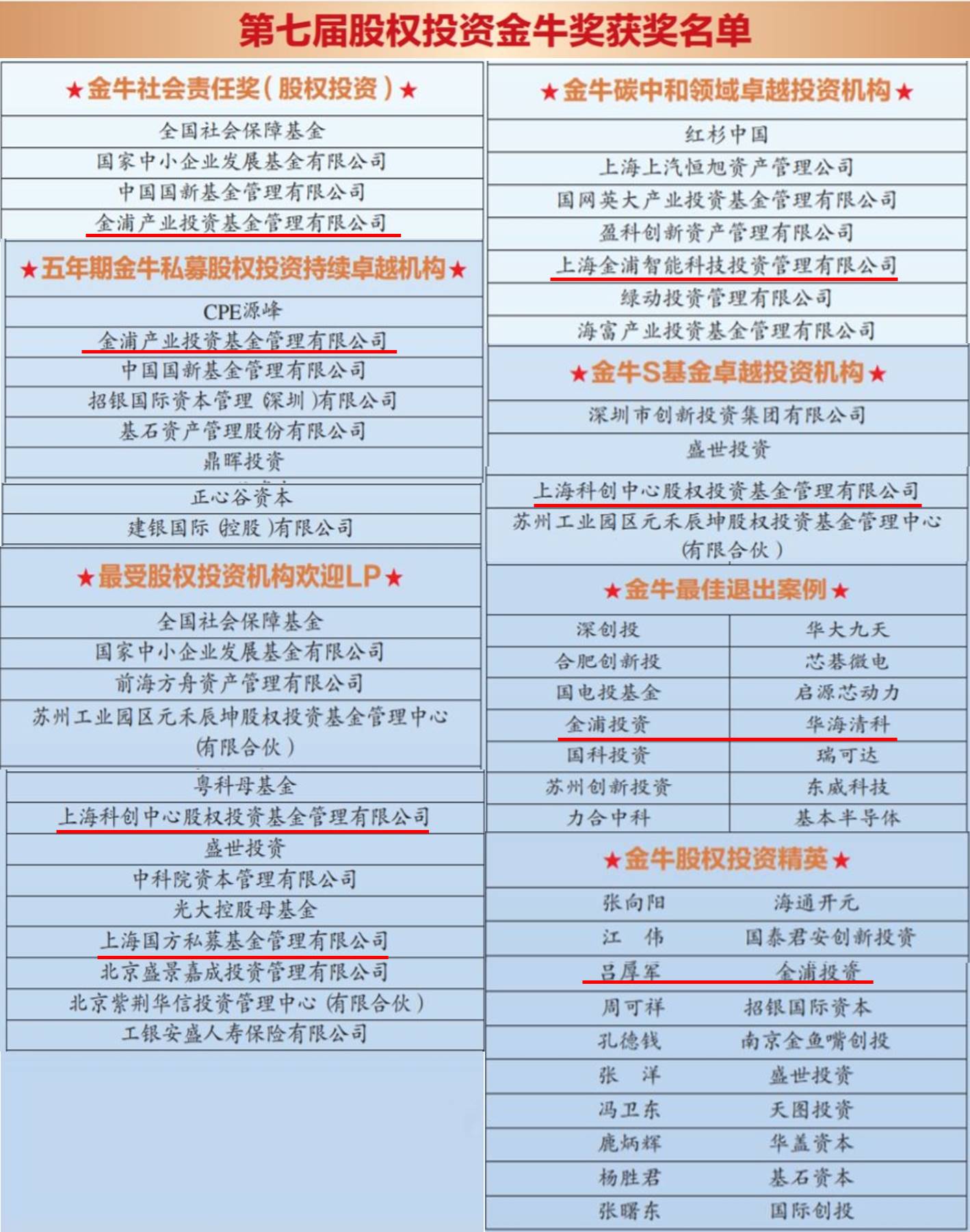 11月7日,在中國(guó)證券報(bào)主辦的“新質(zhì)創(chuàng)時(shí)代 投資新生態(tài)”2023股權(quán)投資發(fā)展論壇上,第七屆股權(quán)投資金牛獎(jiǎng)榜單公布。集團(tuán)旗下金浦投資、上海科創(chuàng)基金、國(guó)方創(chuàng)新斬獲 “金牛獎(jiǎng)”多項(xiàng)大獎(jiǎng):