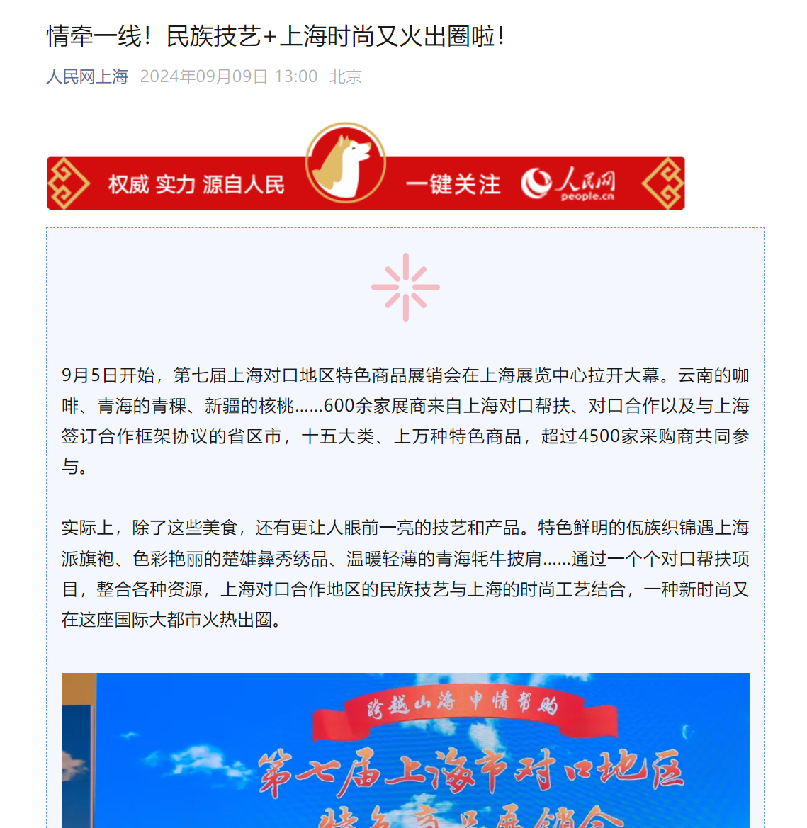 【編者按】2024年9月5日至8日,第七屆上海對口地區(qū)特色商品展銷會在上海展覽中心舉行,開幕當天,市委書記陳吉寧、市委副書記、市長龔正現(xiàn)場察看特色商品、了解消費幫扶工作推進情況。國資經(jīng)營公司第七站文化遺美項目——云南國家級非遺技藝佤族織錦登上展銷會中央舞臺,通過佤族織錦與上海海派絨線編結技藝的融合創(chuàng)作,為上海市民帶來了一場視覺盛宴,有效推動非遺技藝進一步傳播推廣。當天活動獲得上觀新聞、人民網(wǎng)上海、普洱市電視臺等多家媒體報道。