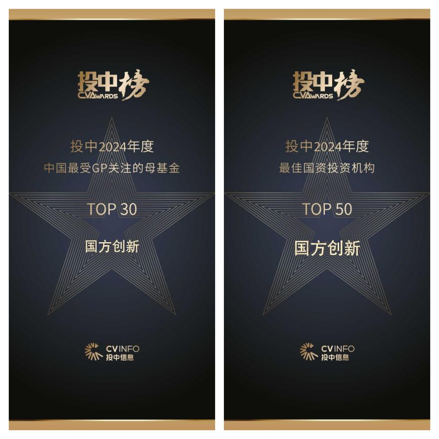 國方創(chuàng)新獲“投中2024年度最受GP關(guān)注的母基金TOP30”和“投中2024年度最佳國資投資機(jī)構(gòu)TOP50”。
