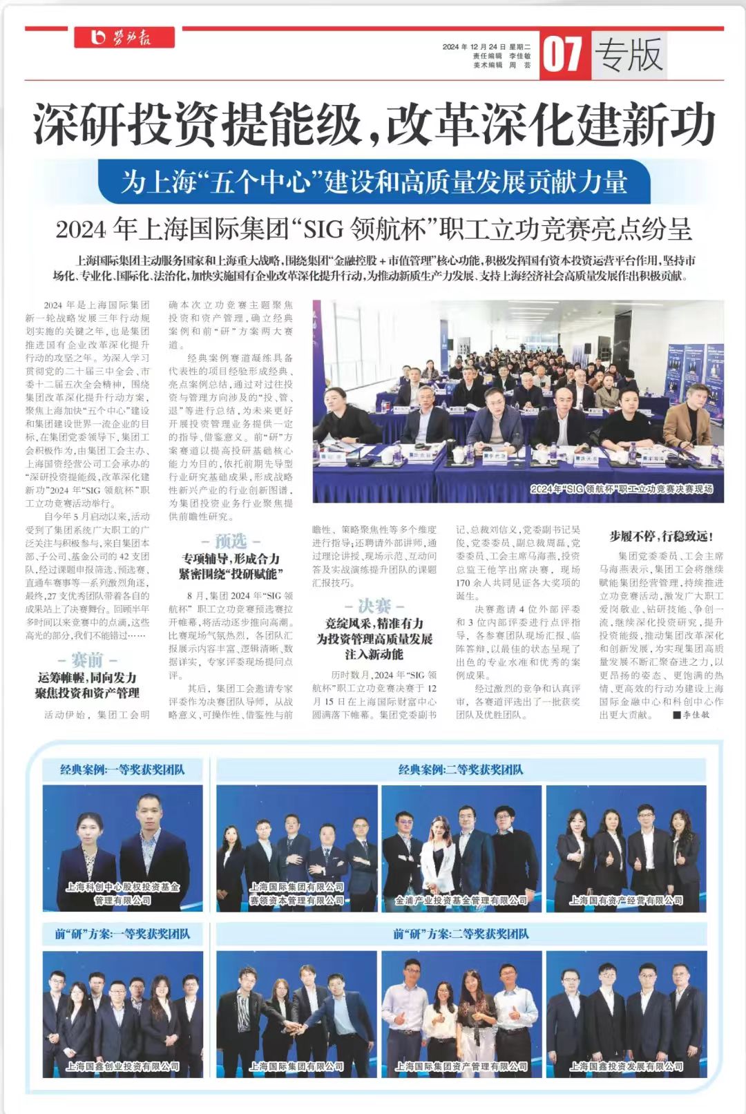為深入學(xué)習(xí)貫徹黨的二十屆三中全會(huì)和十二屆市委五次全會(huì)精神,圍繞集團(tuán)改革深化提升行動(dòng)方案,聚焦上海加快“五個(gè)中心”建設(shè)和集團(tuán)建設(shè)世界一流企業(yè)的目標(biāo),由集團(tuán)工會(huì)主辦、國資經(jīng)營工會(huì)承辦的“深研投資提能級,改革深化建新功”2024年“SIG領(lǐng)航杯”職工立功競賽,歷時(shí)數(shù)月,于12月15日(周日)在上海國際財(cái)富中心舉行決賽。集團(tuán)黨委副書記、總裁劉信義,黨委副書記吳俊,黨委委員、副總裁周磊,黨委委員、工會(huì)主席馬海燕,投資總監(jiān)王他竽出席決賽,集團(tuán)職工近170人參加活動(dòng)。